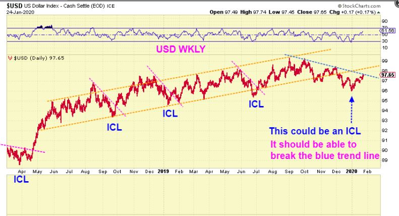USD DAILY – I felt that the USD was breaking down and it was due for an ICL. I think that it just put one in place, but I want to add that the USD temporary strength has not hindered Gold. How far this can recover remains to be seen. It may just back test the orange line.