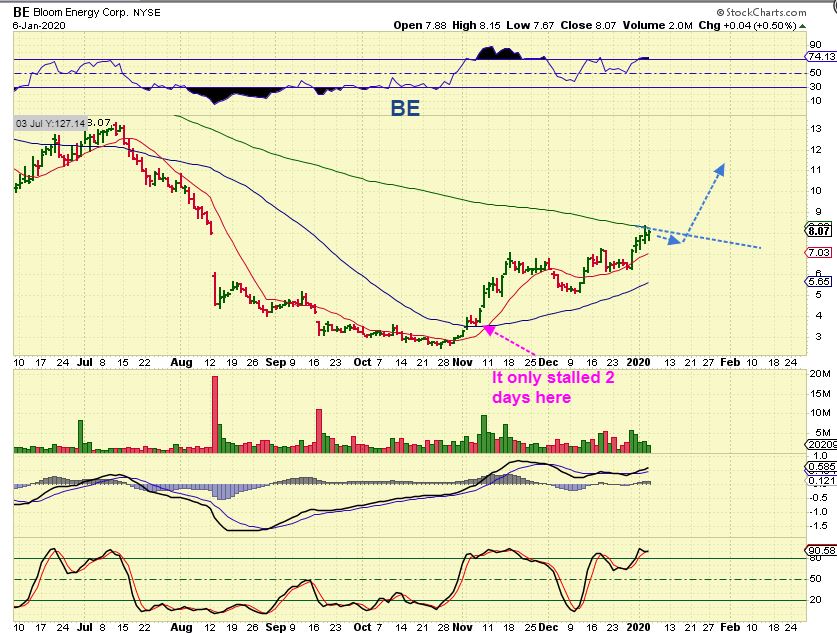 THIS WAS BE ON JAN 2 – BE sold off in the morning but closed up 5.5% again. I am getting slow progress with this one and that Gap finally filled, but I’d really like to see the volume grow & not continue to shrink as it runs higher.