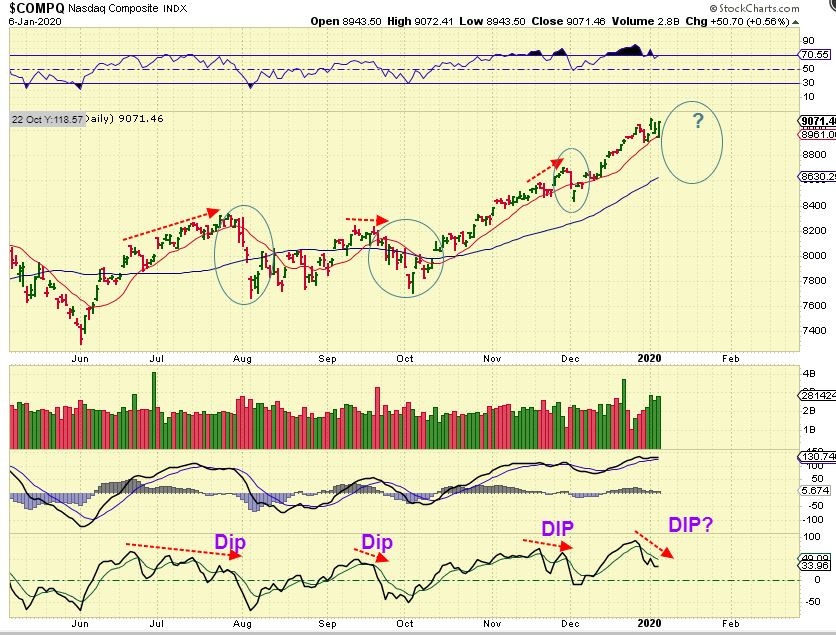 SPX – The SPX gapped down slightly below the 13 sma and then recovered, so we might have a 1/2 cycle low. It is day 22 and that is getting late in the daily cycle, and I also do still see divergence, so this may become choppy & toppy soon. Let’s look at the Nasdaq…