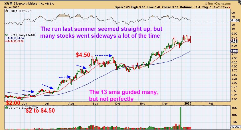 SVM – When SVM ran over 100% from $2 to $4.50 in May through August, was it just straight up? Not at all. It looks more like 4 days up, and 10 sideways, 4 more up, and 8 sideways, and so on.