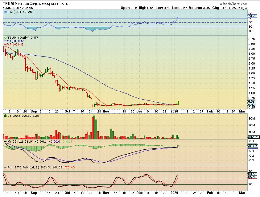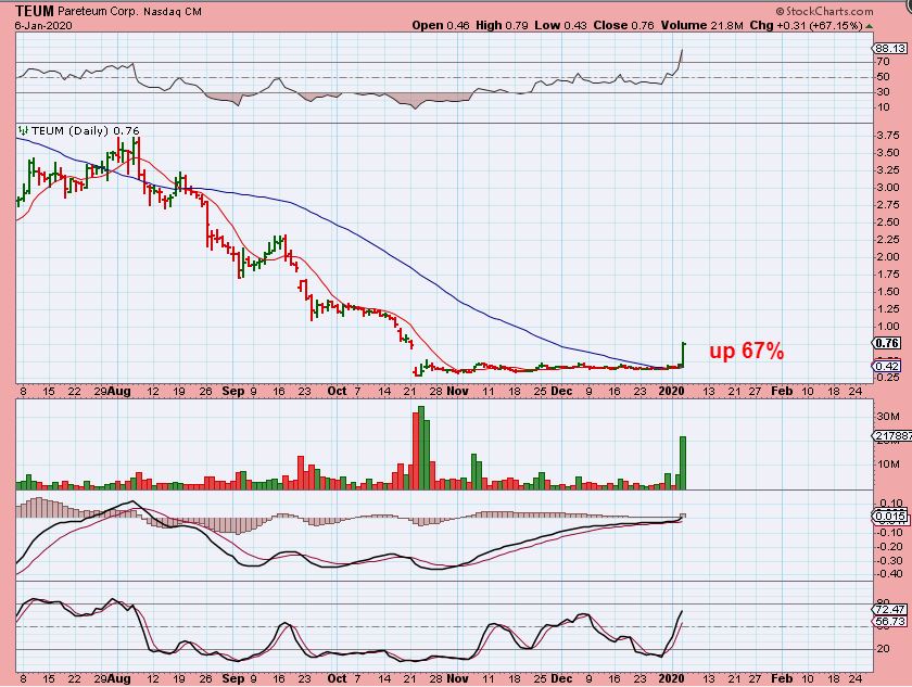 TEUM – It shot up 67%. This is why I love quickly trading long bases with volume surges, or , BUY & HOLD if I like the sector. This is not a safe buy here, I’m just pointing out why I like the long tight bases.