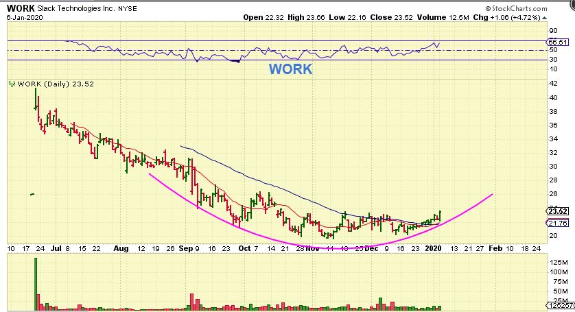 WORK – This is another view and why it looks bullish as it moves away from the 50 sma. It could be a rounding bottom base. I bought it with a stop at the 50sma.