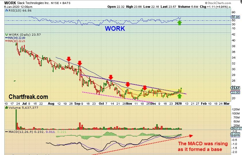 WORK – This is another stock that Popped a little and broke a down trend. This can be bought here, and it should continue higher . Another view…