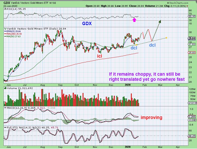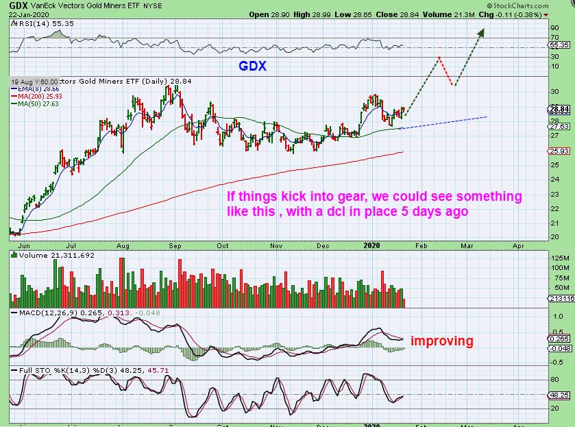 GDX #2– THIS WILL FRUSTRATE US , but it can happen. This would be a sideways choppy daily cycle that still becomes R.T. and eventually puts in a higher dcl. Since neither you nor I can force GDX #1 to happen, let’s just hope that we see some immediate upside sooner than later. GDX #3 would be ok too…