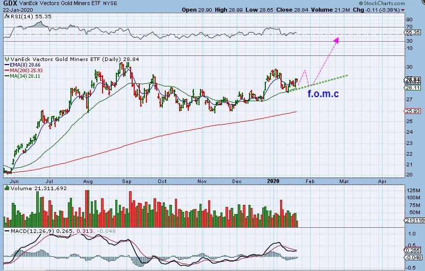 GDX #3 – A POP & then a DROP into the F.O.M.C. mtg next week is also possible. Then we could see the General Markets top and drop to a dcl as GDX then launches into the next run.