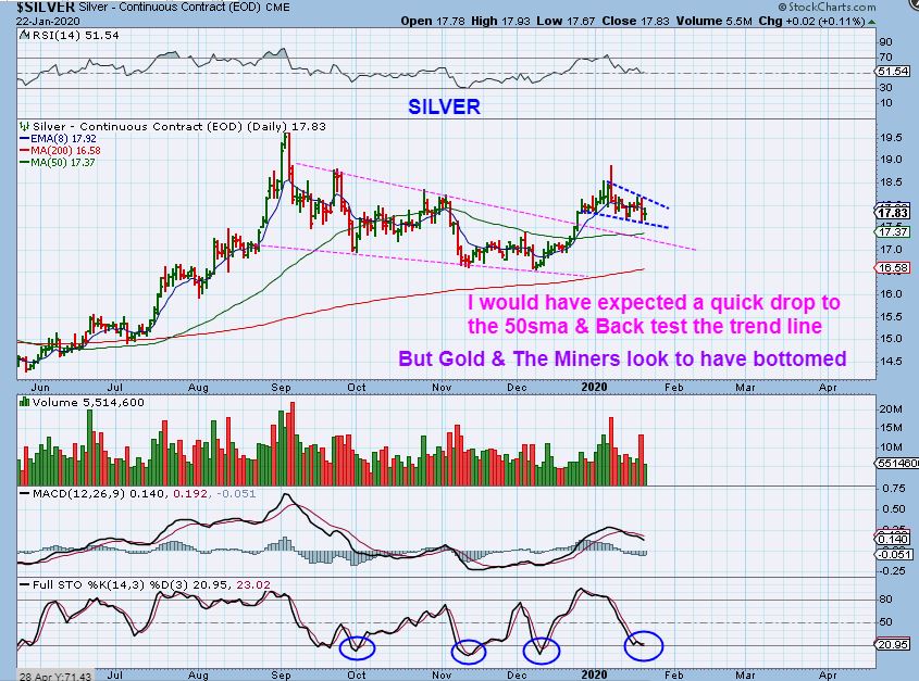 SILVER – I expected a drop to the 50 sma for Silver, but it appears that the lows are in place for GOLD & The Miners, so Silver has probably bottomed on day 32. Read the chart. I doubled checked a few other things and found…