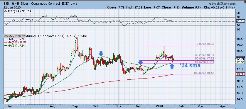 SILVER – I doubled checked a few other things and found that Silver hit the 50% retrace line & the 34 sma, another moving average that often interacts with price. So this really could be a dcl on day 32 that matches Technical Analysis.