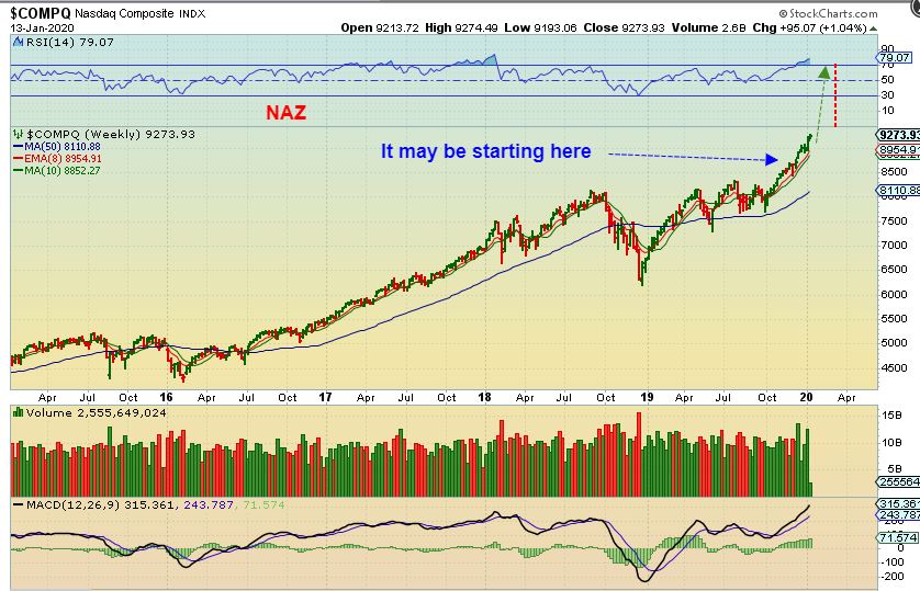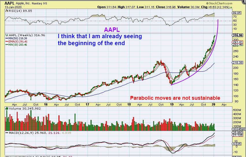 AAPL – I have seen parabolic moves in the past and they do not consolidate sideways on a weekly chart. They get steeper and steeper and suddenly there is a big crash. AAPL and a few other stocks look parabolic already. $200 to $300 had only a slight consolidation.