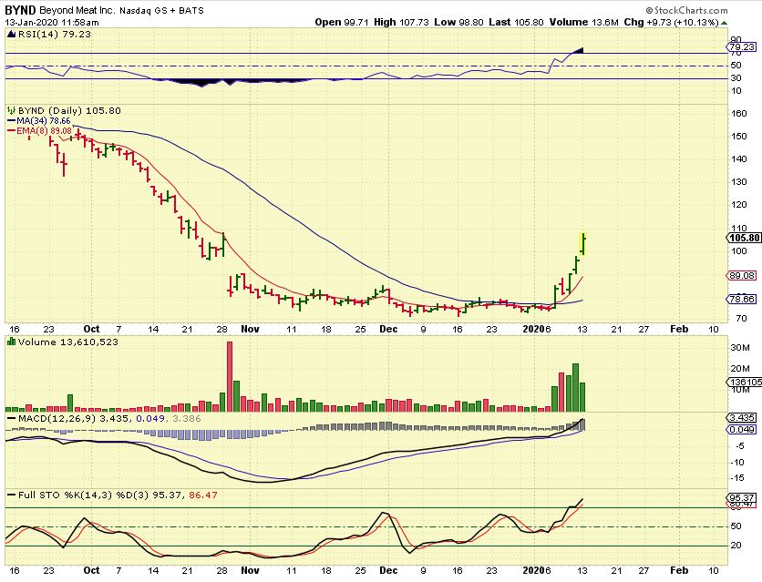 BYND – I grabbed this midday to show that it is running again. It actually closed up even higher at $114+, up another 20%. I always say that a move out of a base can be simply acceleration and just run to prior highs. Waiting for a pull back can leave one behind.