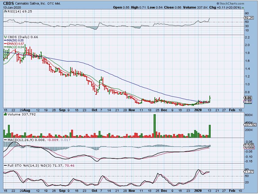CBDS – It ran to 71 cents ( up 26%) and then pulled back. I really like these long bases, so I want to try to hold this for a few days and see if we get some nice follow through. Some of these have had incredible follow through lately…