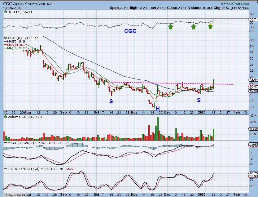 CGC– I posted this chart of CGC on Dec 9th and it broke the 50 sma, however…