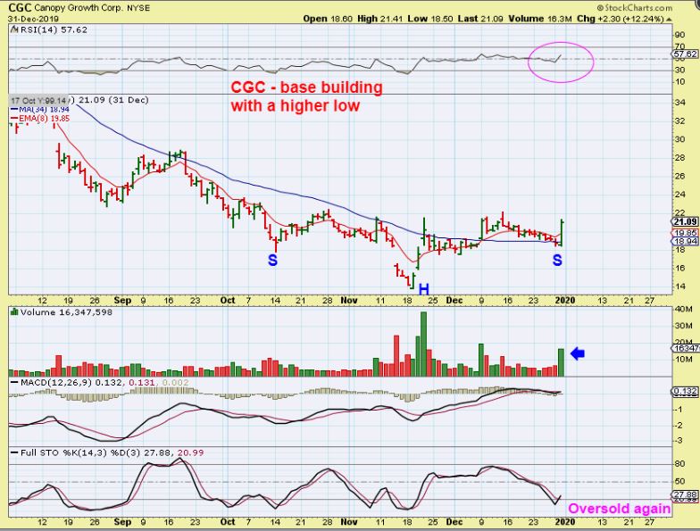 IF CGC is ready to go and the entire sector starts to run, the selling to new lows may be over for many of these. I will post more of them as they begin to shape up, but you can keep your eye on a watch list too, for progress. See HEXO, ACB, TGODF, ISOLF, TRTC, SPRWF, etc