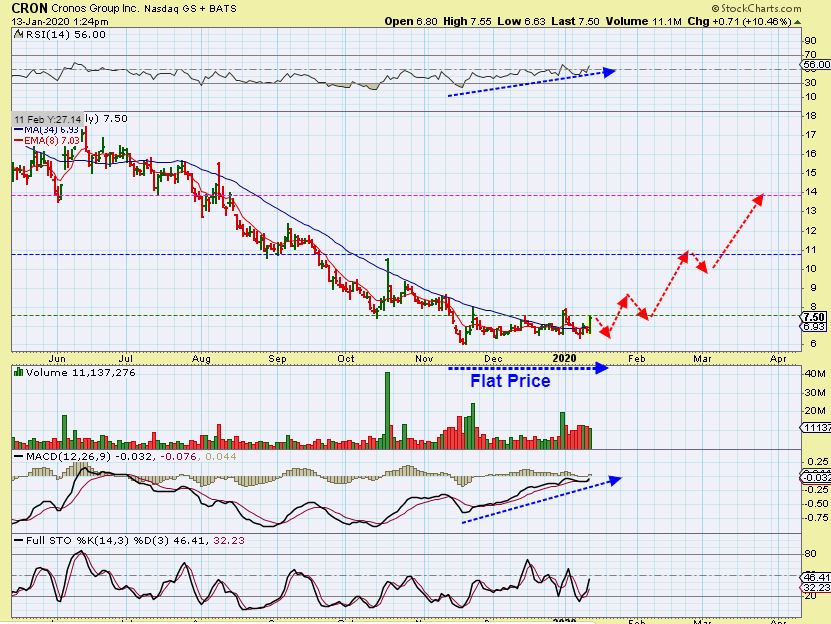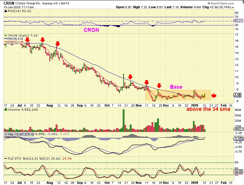 CRON – So I posted CRON at $7.18 in our live trading area and bought it as it crossed the 34 sma Monday. It also has a long flat base.