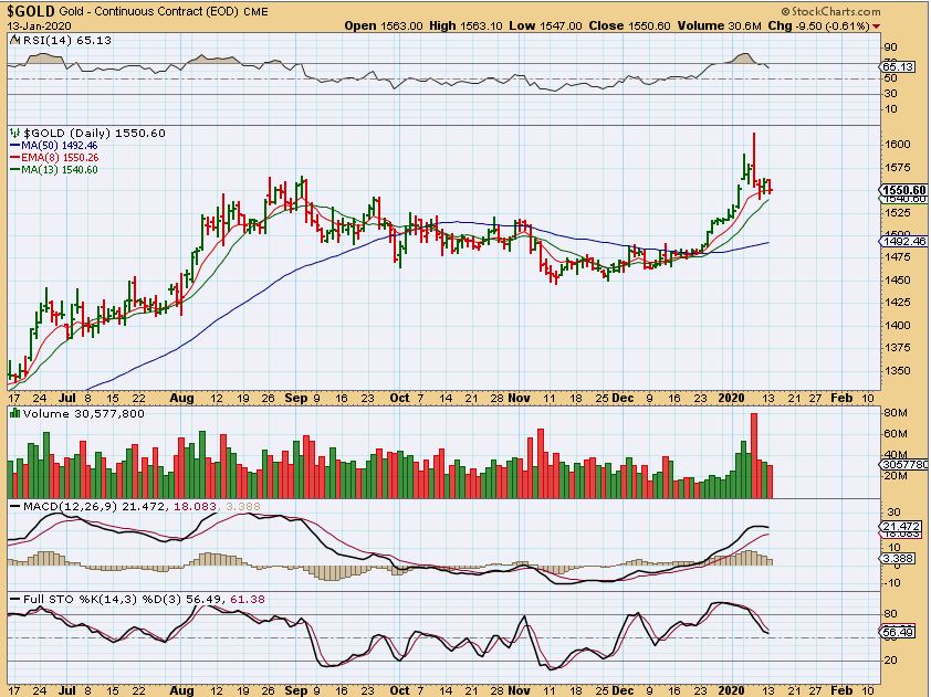 GOLD – As I write the report Gold dropped further, but it still looks normal. Unfortunately the BIG POP at the Iran Missile launch exhausted the run in the short term. I don’t think that it terminated the run, but those exhaustive moves often top it for a bit.