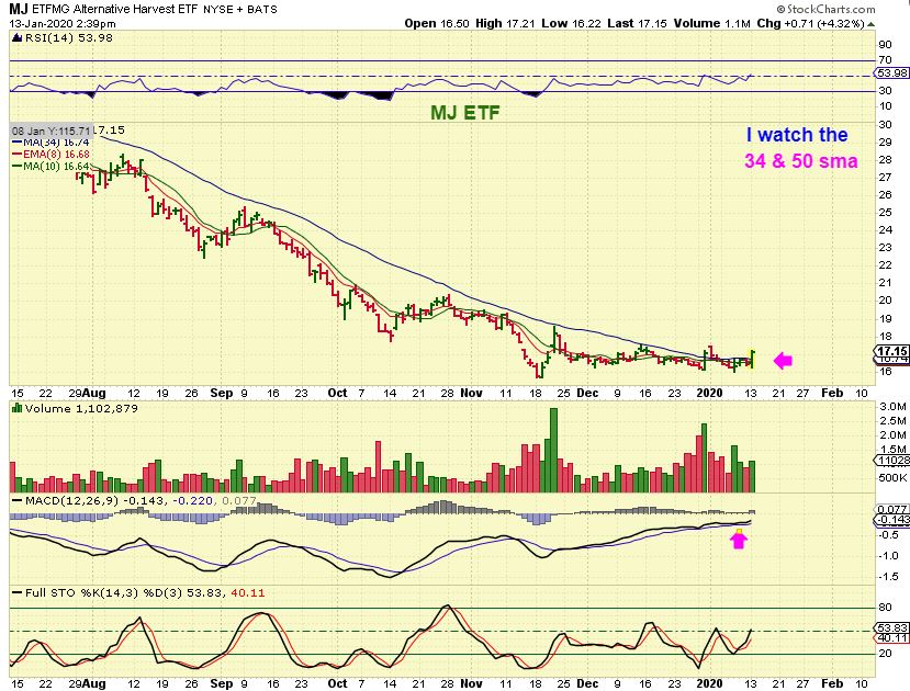 MJ ETF – I have covered this sector in December as a deeply oversold sell off that looked to be basing out. Some of the MJ Stocks have been very progressive. This is a flat base and on Monday MJ closed at $17.34 and that puts it above the 34 sma & the 50 sma too. Now lets look at a few stocks again…