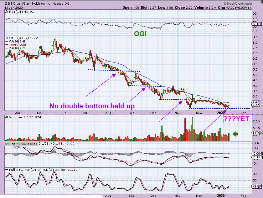 OGI – Is it ready yet? I can’t say for sure, but this dropped from $8 to $2 over the past 8 months. When it runs, it could make some nice gains percentage-wise So far this has not had a double bottom low that didn’t break down though, so a TIGHT stop would be necessary if this reversal is bought.