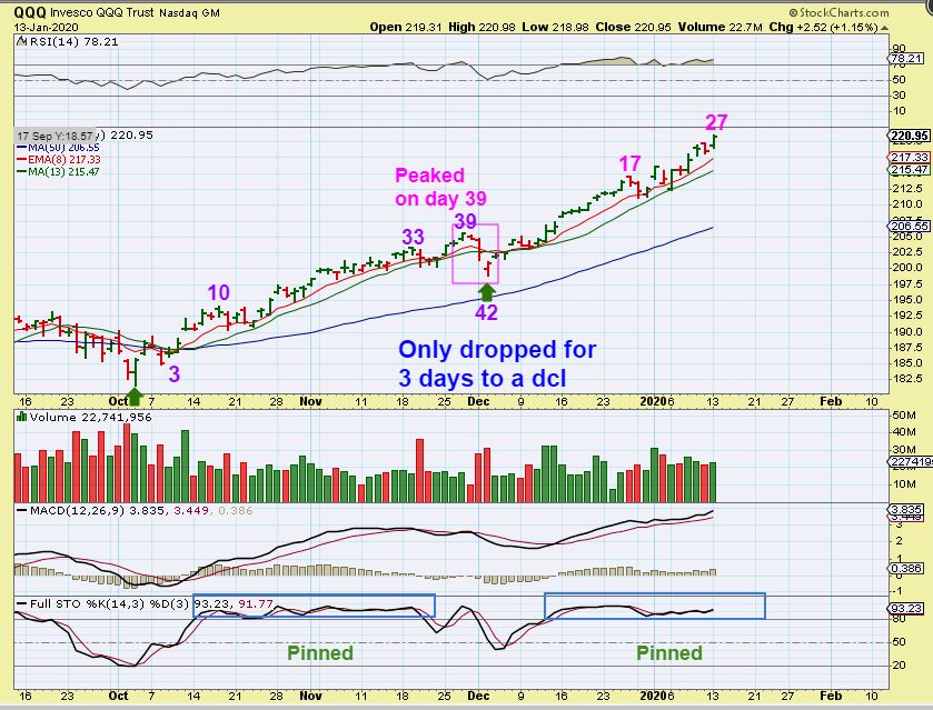 QQQ – We are watching another strong run out of a dcl, and it appears to be even a little steeper than the last one. This has had me wondering if we would see a Melt up type of a run in the General Markets. I have mentioned that a few times.