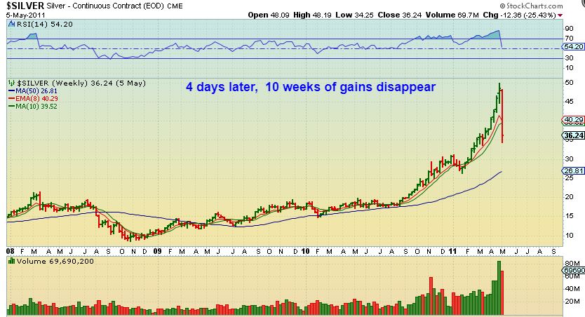 SILVER PARABOLIC CRASH – in just 4 days 10 weeks got wiped out. This is a 1 week drop made up of only 4 days. This is how they end.