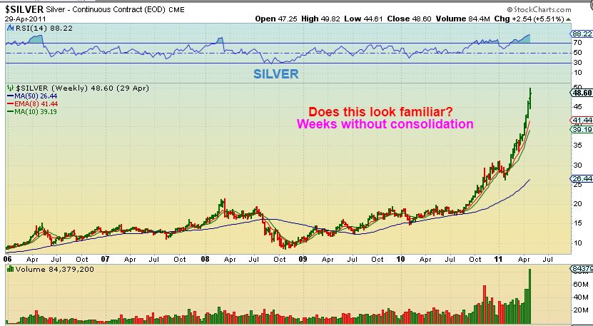 SILVER PARABOLIC – This was the SILVERs parabolic ramp higher. We saw 10+ weeks of straight up without any real consolidation. Great gains, right? And then…