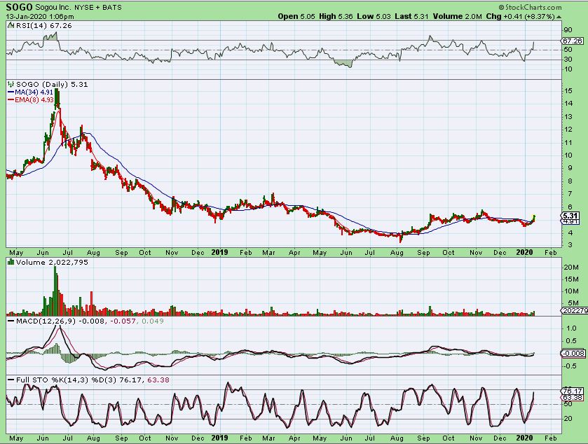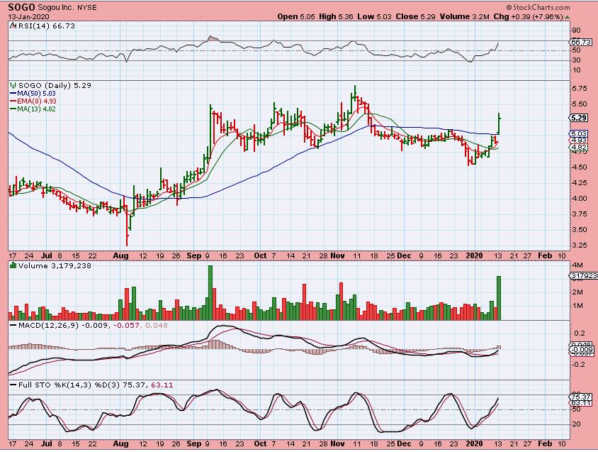 SOGO – The Chinese Companies were popping ( YY, YELP, BIDU, etc), so I discussed SOGO on this chart. It looked ready to break that 50 sma ( a buy) .