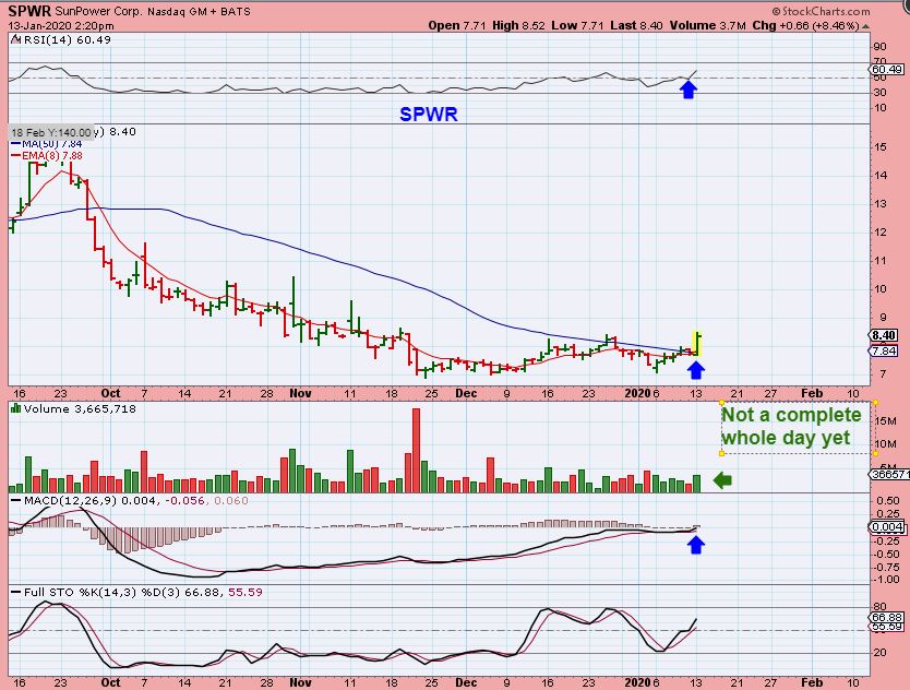 SPWR – Now SPWR has popped out of a base and above the 50 sma. This is worth watching and it could be bought here too, but it may bull flag or dip & then run. It is a good base in a good sector. Look at 3 month charts of JKS & CSIQ to see how some of these can run out of the lows.