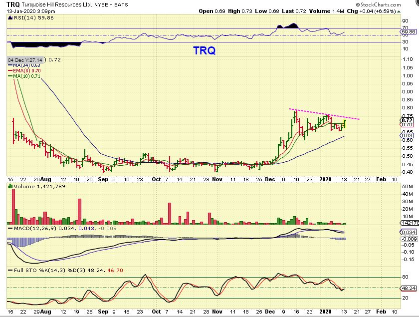 TRQ – The Precious metals Sector isn’t quite ready, but TRQ is a bullish set up. It may dip to that 50 sma one more time, or it may break out. A break out could be bought with a stop.