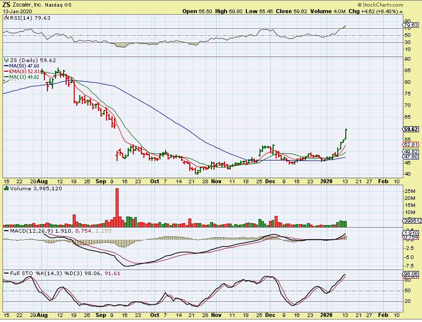 ZS – This is what I mean. ZS also started up slow off of that 50 sma, but once it broke, it is really stretching out now. It was filling a gap with no resistance, but leaving a base can accelerate a move too.