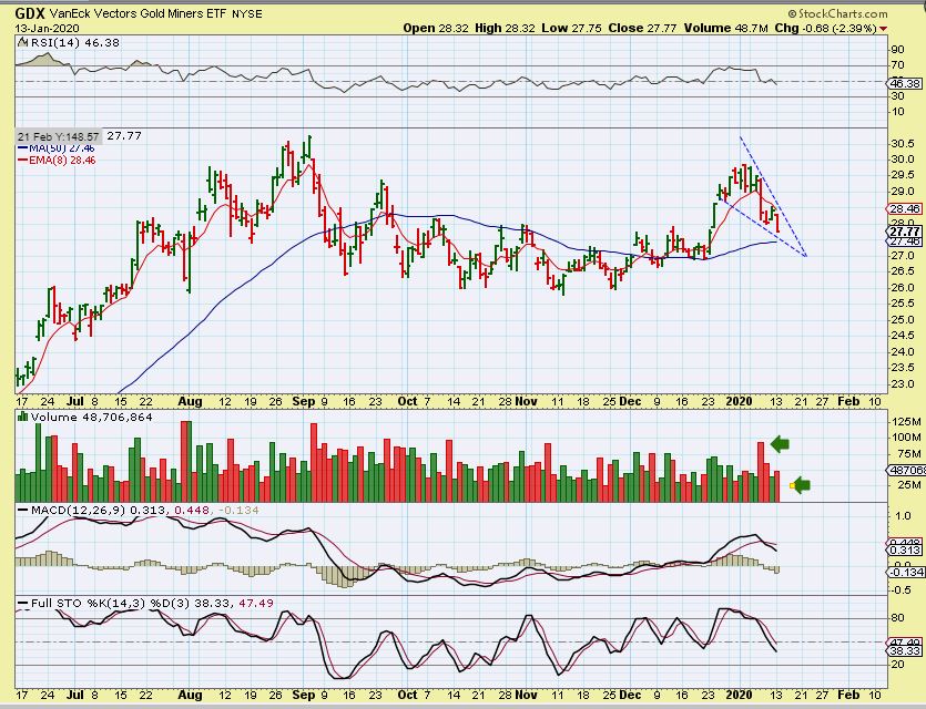 GDX at the close – We knew it could drop & it did. This could be a bull wedge, but we’ll have to see if it breaks up after tagging the 50 sma or not. We saw lighter selling on this drop than we did last week, so sellers may be in control, but they also may be drying up. We need some buyers to come in and prop up price.