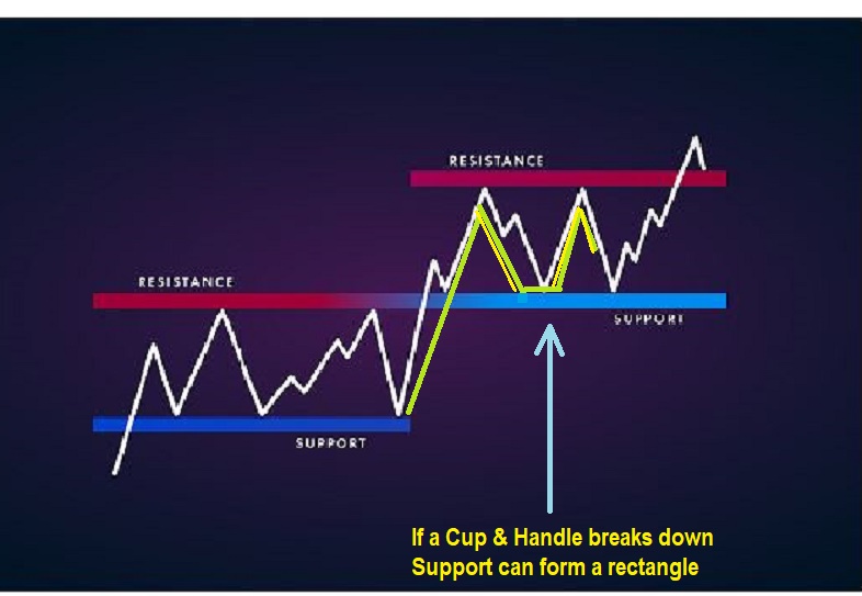 This is the opening Theme picture, but I have doctored it up a bit with a green cup. I DID NOT EXPECT THIS TO HAPPEN, but I was asked, “WHAT HAPPENS IF THE CUP & HANDLE BREAK DOWN WITH GOLDS SELLING? DOES THAT MEAN IT IS BEARISH?” It doesn’t, but it can happen. So here I am showing that rectangle consolidations form when price rolls lower between upper resistance and lower support. If a handle drops down too far, it is no longer a ‘cup & handle’ and it can become a normal box or rectangle consolidation. The blue arrow that I drew in here is pointing out a cup & handle that failed. What may have started as a cup turned into a tag of lower resistance. Currently I am looking for a bounce from that wedge shown above and do not expect this.