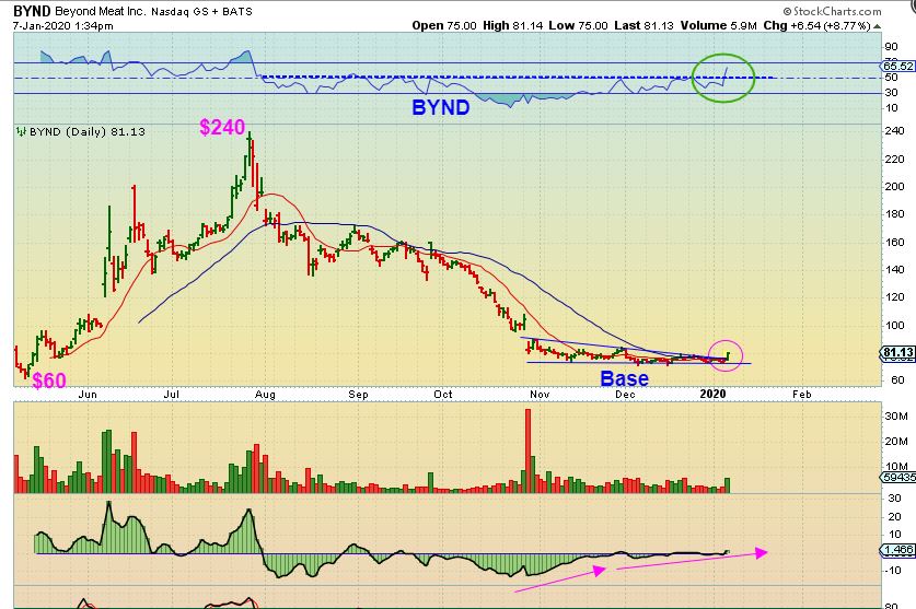 BYND  – This is a stock that ran from $60 to $240 in 2 Months!  After the Hype finally died down, so did the stock.  I’m looking at a base that formed after that sell off & suddenly it Popped with volume  (8%). Large divergence also formed.  Let’s also zoom in on price…