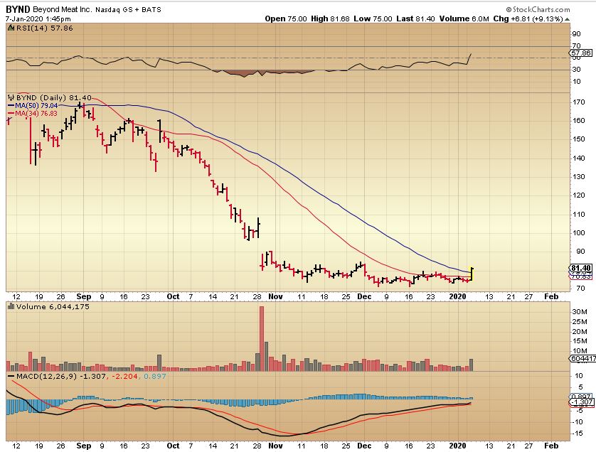 BYND  – Price popped above the 50sma too, and this volume was as of midday, it ended up closing up 12%.  I think that this has great potential over time.  Will it run straight up? I can’t say.  I usually start with a small position and try to add on dips.