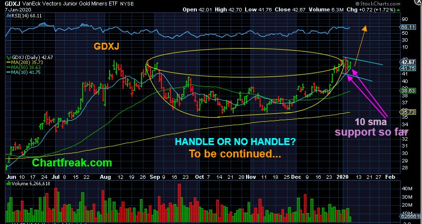 GDXJ – I see that GDXJ has formed the cup, so a handle formed during a consolidation period CAN take place, but price  did reverse right off of the 10sma.  This may just break out and move higher. I posted this on Twitter yesterday, so you can ignore some of what is written on the chart.
