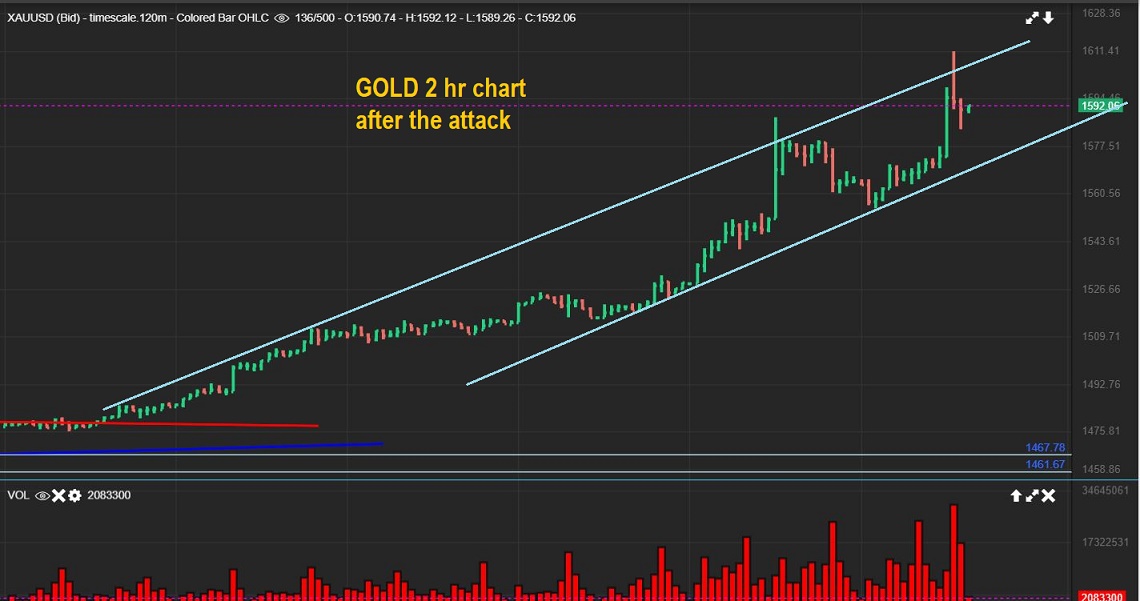 EDIT:  GOLD 2 hr after the Iran Missile Strike – There was a ‘News Event’ that Popped Gold higher tonight. It has already dropped back down, so this is the current pattern as of roughly midnight Eastern Time.  News events paint the chart, but are often temporary too.