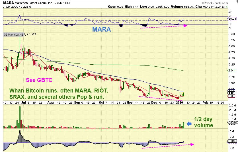 MARA  – This is 1 example for now. You can look up the other charts of OSTK, RIOT, SRAX, MGTI, etc .  This tiny pop was 12% and it could break out & run. The volume came in very strong by the close, and it looked the same on GBTC, RIOT, etc.
