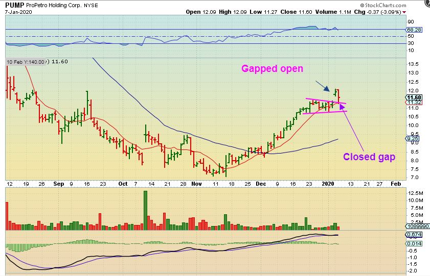 PUMP – And PUMP was another that I was watching.  It also moved sideways at the 10sma, but it suddenly Gapped open on Monday. Let’s zoom in.