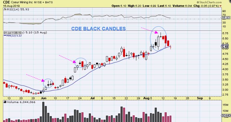 CDE BLACK CANDLES in 2019 – We had a lot of Black Candles with yesterdays reversals at the highs. Black candles can often signal a short term top (not always, but often) so I used this CDE chart to show the black candles that it formed, and how the pull back can be mild or start the drop into the dcl. What we get remains to be seen.
