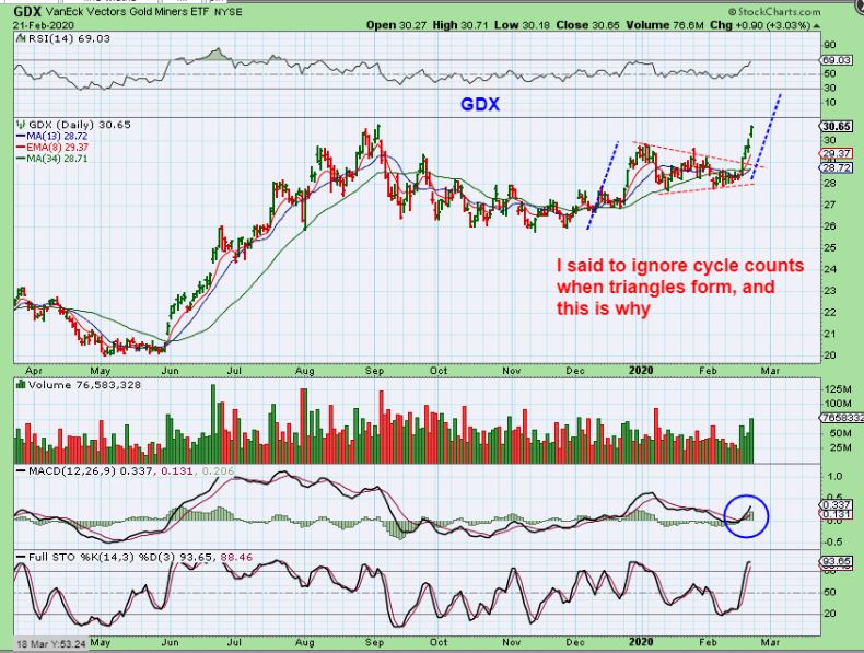 This triangle formed in about 23 days of the daily cycle, and I had people emailing me & telling me that it was too late to but the triangle break out. I said that a break out of that triangle is a ‘buy’ in technical analysis, period. I also said that I Ignore cycle counts with triangles, since this could run straight up to day 30 or so & then dip later. So far, excellent gains have been made in many miners.