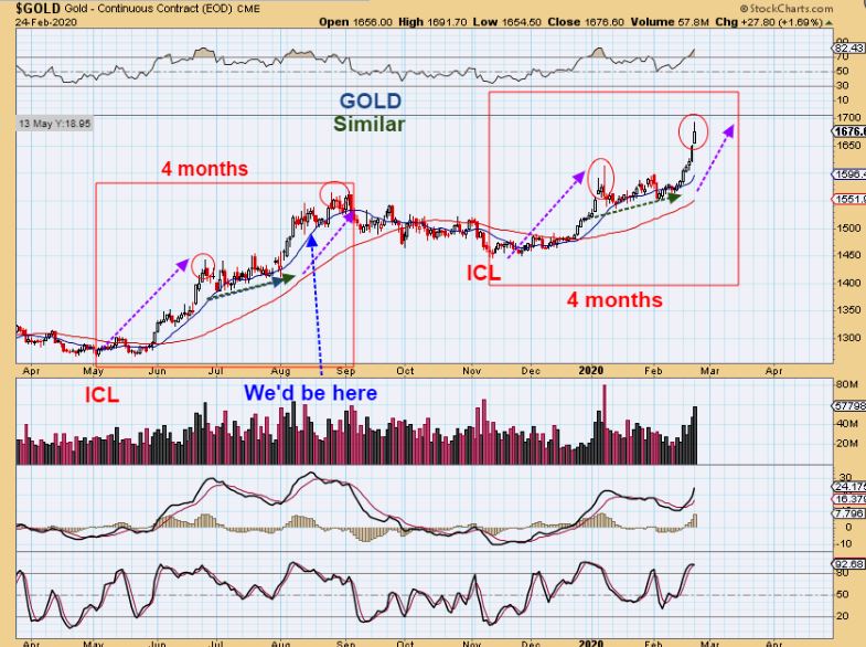 GOLD – Here I am showing that the last run out of the MAY ICL lasted 4 months to the peak. I wrote’ We’d be here‘ to show how it played out from this time forward. It chopped & Popped to a new high before seeking out the next ICL. This is NOT etched in stone, we could even run to $1800 as the markets drops down, but this is todays view of yesterdays reversal.
