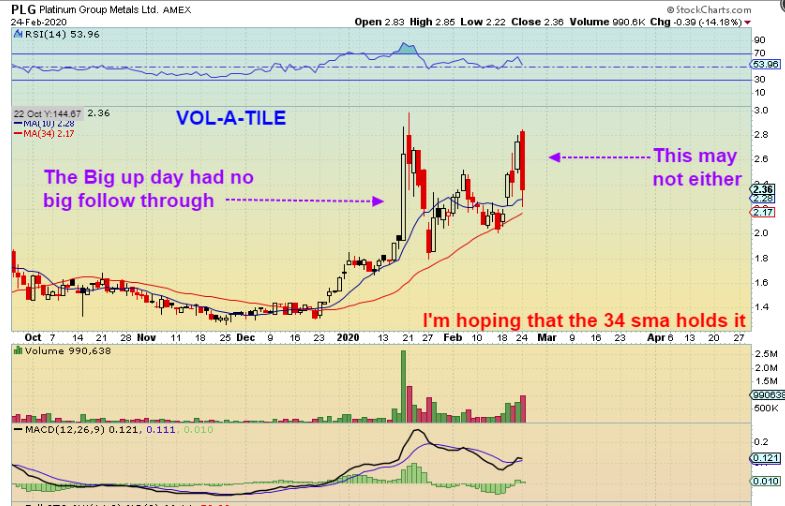 PLG dropped 14 % Monday. In January it had a very strong up day, but no real follow through higher. Now we have a strong drop that may run out of steam too. I’ll be watching for support to see if this selling dries up. Was this completely unexpected??…