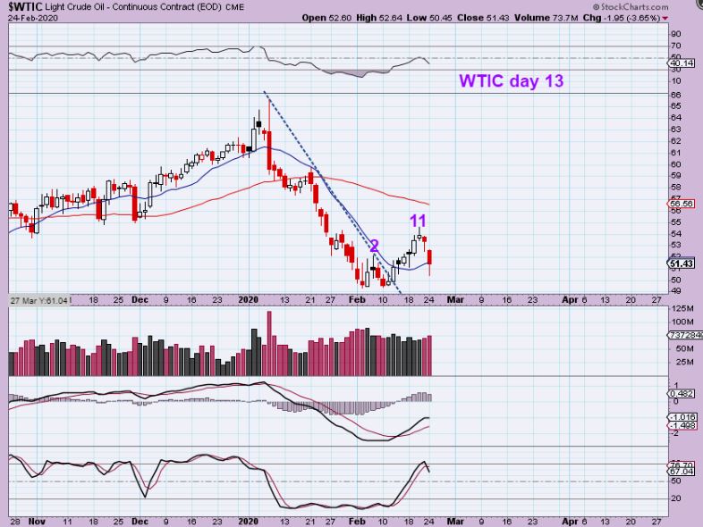 WTIC – Oil dropped and came back enough to regain the 13 sma ( not the 10). I am not in Oil or OIL/Energy, and will continue to pass for now. If this breaks the lows with a day 11 peak? This will then crash down with the markets. The MACD looks good, but I want to watch from the sidelines right now.