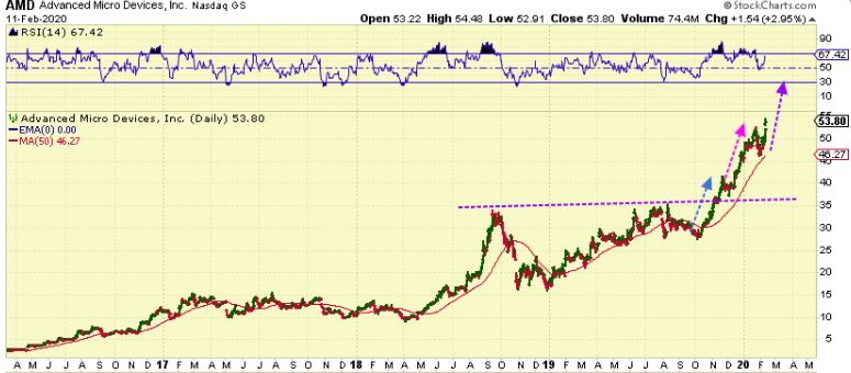 AMD – I could see this doing another $10 run or so before peaking, especially if markets run away higher. If they just roll into an ICL, this top could look similr to the 2018 top. I will NOT ride it down, I use stops.