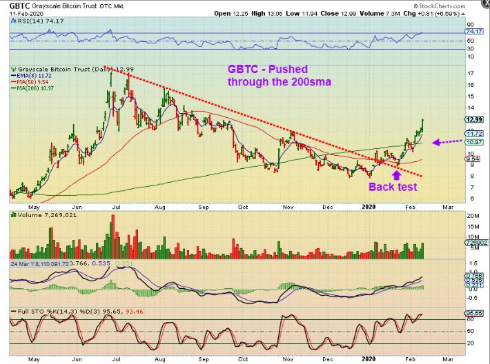 GBTC – I pointed out Bitcoin ( and some Blockchain stocks) as bullish in December & January and here GBTC was now breaking above the 200sma …