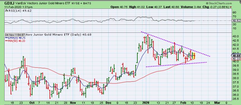 GDXJ – There is a possible triangle forming in GDXJ. If this were to break out & run higher, it could get to the $47+ area.