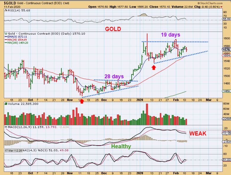 GOLD – Gold is in a long choppy consolidation, and as pointed out, we got the same thing in the first daily cycle, but it did end up breaking out late in that cycle. So far we have no break of the lows yet, and no break out higher. The difference between the 2 areas is that the MACD seems to be weakening during this chop, but so far the lows are in tact.