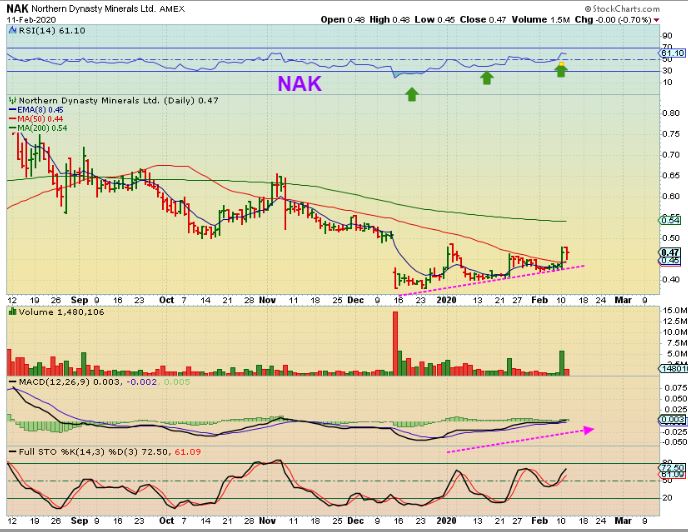 NAK is an interesting set up. It has put in a series of higher lows, broke above the 50 sma with a strong volume pop, and seems to have capitulation lows in place.