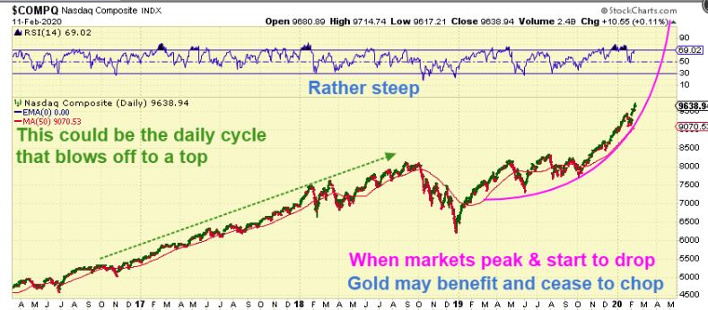 I would think that when these General Markets top & begin to drop, Gold will then begin to pop. The parabolic run in the Tech bubble that ended in 1999-2000 started the Bull Run in Gold. The hard part is knowing the timing for these changes, so we continue to watch for clues. At least this time, the Bull Run in Gold has already clearly begun.