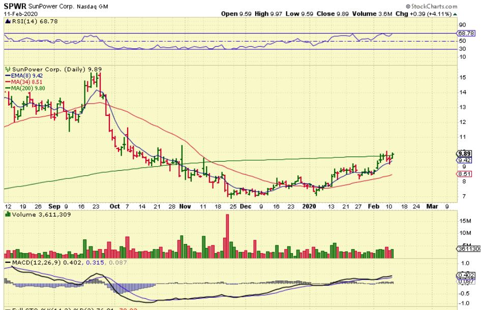 SPWR – Today it is pushing on the 200sma, and Other Solar stocks are doing well, so this could be bought with a stop under $9 – the recent low. Let me show you how some other Solar stocks are performing…