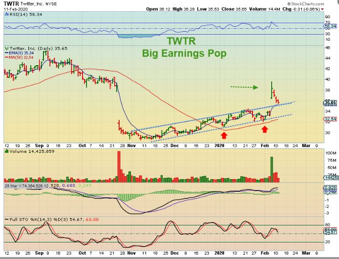 We have discussed a few different Tech stocks like TWTR, PINS, etc that already have earnings in place. I Keep those on a watch list, since they should start trending higher after they consolidate the gains. IF the tech sector goes parabolic, these are still near the lows, but can play catch up quickly by running to recent highs. If we drop to the ICL soon, these may back just test the 50sma & bounce around, but they are worth watching ( or owning on a reversal) since they already beat on earnings. Below are a few stocks in recent reports, but there are many more. A list is good to have to check the charts daily.
