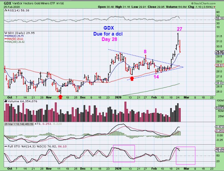 GDX – Day 28 saw GDX drop sharply ( 3.5%). It can bounce at the 10sma, but still have further downside, because on a dip into a dcl, we get a break of the 10sma.