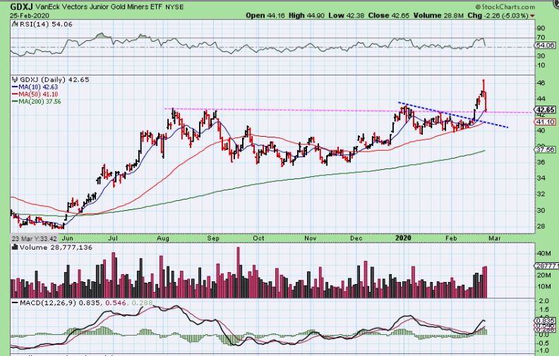 GDXJ – Well GDXJ came down fast, dropping 5%! I honestly expected a drop, but not that sharp and that fast. We’ll just have to see how this plays out. It could bounce Wednesday and then slowly chop down into a final low or something along those lines. An eventual tag of the 50 sma & blue trend line is very possible.